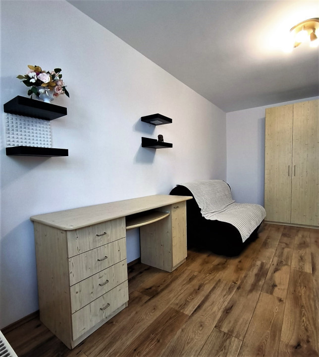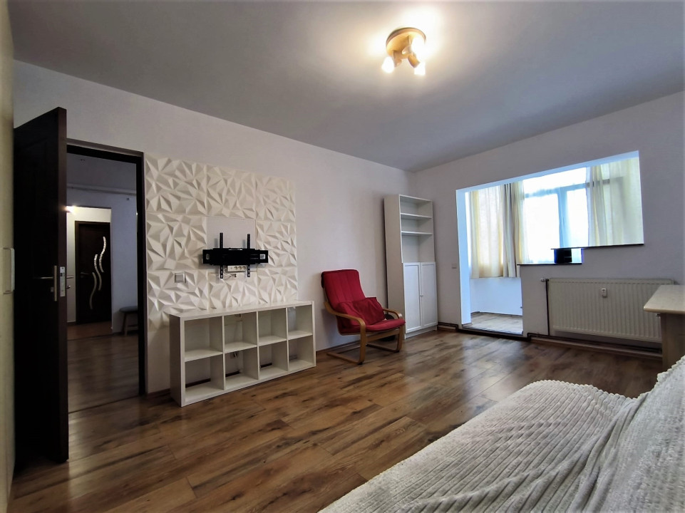 Apartament cu doua camere, situat in Dacia la etajul 1, complet mobilat si utilat. Are un dormitor cu pat matrimonial si spatii de depozitare, o bucatarie complet mobilata si utilata (plita pe gaz, cuptor electric, masina de spalat vase, masina de spalat haine, frigider) si un living ce poate fi folosit fie ca si birou sau un al doilea dormitor, avand o canapea extensibila, sau doar o zona in care sa petreceti timpul liber alaturi de familie, fiind decomandat de restul casei.